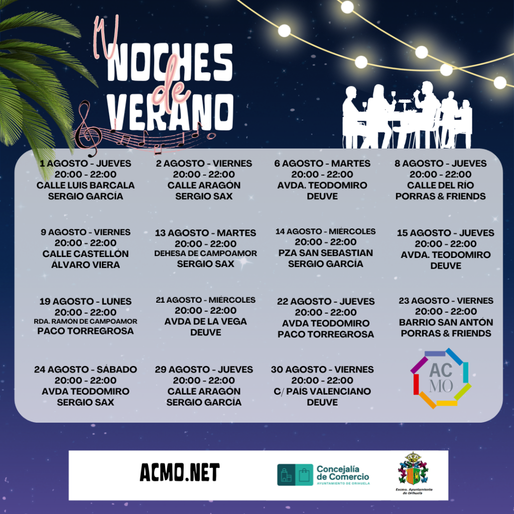 The Association of Traders of the Municipality of Orihuela (ACMO) together with the Department of Commerce has presented the August campaign “IV Summer Nights with ACMO”, “aimed primarily at hoteliers, to liven up the summer evenings-nights in Orihuela. This year we will have a total of 15 performances throughout the month of August in different parts of Orihuela,” explained Ascensio Perez and thanked the Department for their collaboration in order to achieve together “that Orihuela is the municipality we all want, the commercial capital of the Vega Baja.